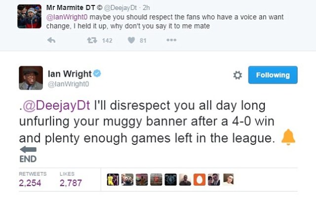 Arsenal legend Ian Wright was Tuesday evening embroiled in a Twitter war with the club’s fan who unfurled the banner asking manager Arsene Wenger to leave during the FA Cup replay at Hull City.