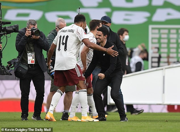 ‘Big moments, big games and big players,’ said Arteta, when asked about Aubameyang’s contribution. ‘I keep saying the same thing. I am trying to convince him he is in the right place. He has done here what he did four weeks ago. I am very positive that he is going to sign.’