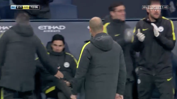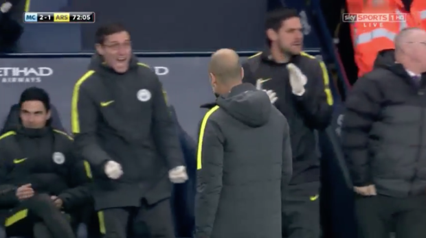 But amid the celebrations for Sterling’s winner, Arteta was glued to City’s bench while Guardiola and the rest of his backroom team were on their feet in jubilation.