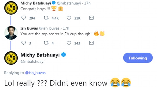 Batshuayi’s reaction made the situation all the more comical, after a fan replied to his tweet stating: ‘You are the top scorer in the FA cup though!.’