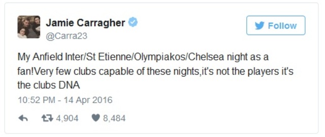 Former Liverpool vice-captain and club stalwart Jamie Carragher was at the game, and could barely contain his excitement at witnessing a famous Anfield European night from the unfamiliar perspective of the stands.