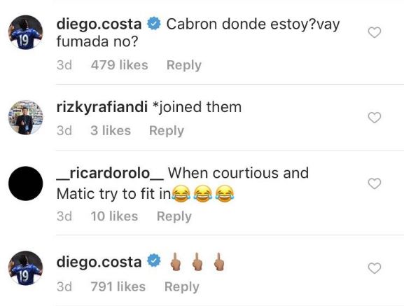 But the move did not go unnoticed by Costa, who responded with an angry message to Fabregas in the comments.