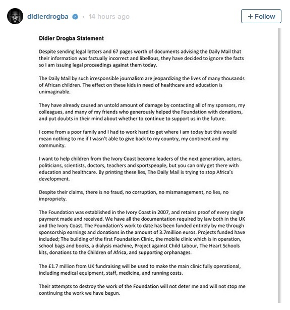 In a statement on Instagram, Drogba accused the newspaper of “irresponsible journalism” which he claimed had jeopardised the lives of thousands of African children.