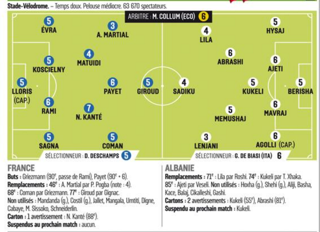 Following France’s lacklustre display in the capital last week, Deschamps tinkered with his starting line-up for Wednesday’s game against Albania in Marseille.