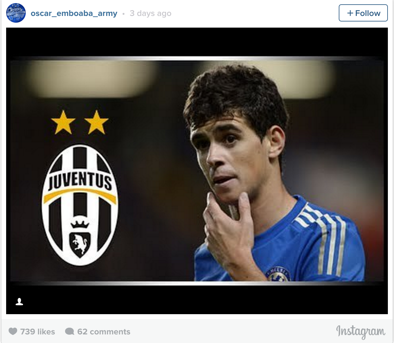 Chelsea midfielder Oscar has dropped a subtle hint on Instagram that he could potentially leave the club in the summer, after liking a post which had a picture of him and the Juventus badge alongside it.