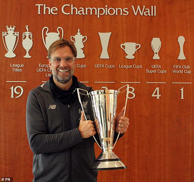 ‘So, I’m absolutely delighted to get this wonderful trophy,’ he said. ‘It’s really wonderful. I saw already the names of who won it before. Obviously some big, big Liverpool names, Bill Shankly, Bob Paisley, Joe Fagan, Kenny [Dalglish] looks like he’s all over the trophy! Brendan [Rodgers], well deserved.