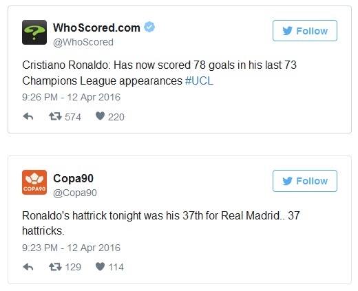Ronaldo’s third marked his 16th goal in just 10 Champions League games since season, his 93rd in total, and the performance had the online footballing community purring at the Portuguese’s record.