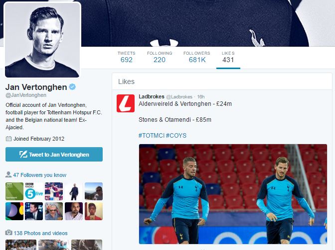 After the game and full of confidence with Spurs cutting the gap at the top of the table to just a single point, Vertonghen checked out the reaction on Twitter.